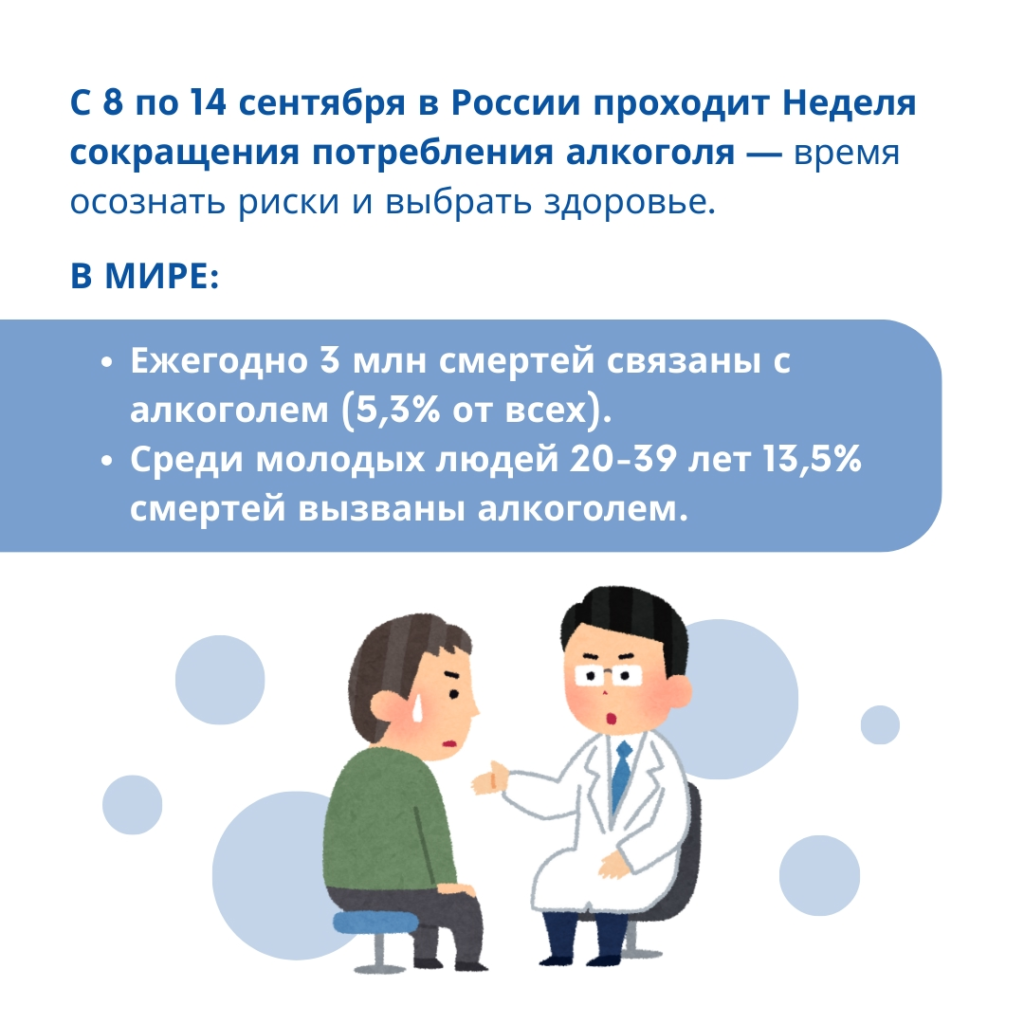 По данным ВОЗ, от чрезмерного употребления алкоголя в мире ежегодно умирает около 3 млн человек. Это 5,3% от всех смертей. У людей в возрасте от 20 до 39 лет с алкоголем связано 13,5% летальных исходов.