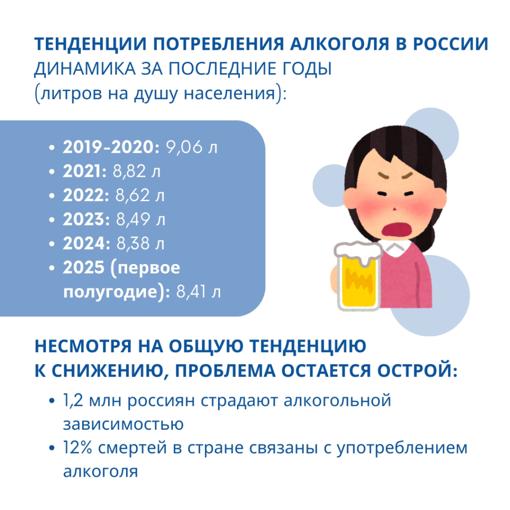 Так, в 2024 году потребление алкоголя на душу населения составило 8,38 л этанола, в 2023-м — 8,49 л, в 2022-м — 8,62 л, в 2021-м — 8,82 л, а в 2019 и 2020 годах значение показателя составило 9,06 л.