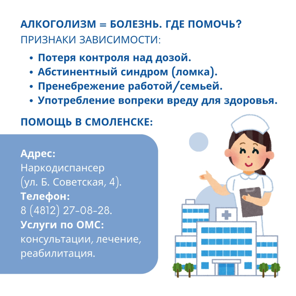 В Смоленске по полису ОМС оказывается консультационная, медицинская и психологическая помощь в ОГБУЗ «Смоленский областной наркологический диспансер»