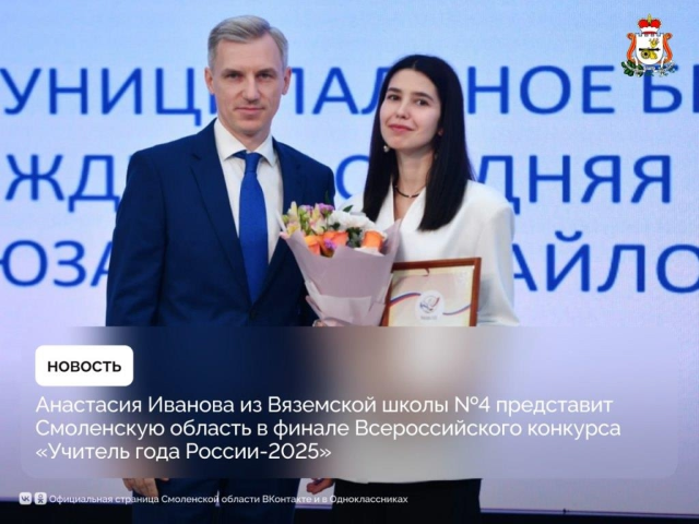 Преподаватель английского языка Анастасия Иванова из Вяземской средней школы № 4 им. Героя Советского Союза А.Б. Михайлова будет представлять Смоленскую область в финале Всероссийского конкурса «Учитель года России — 2025».