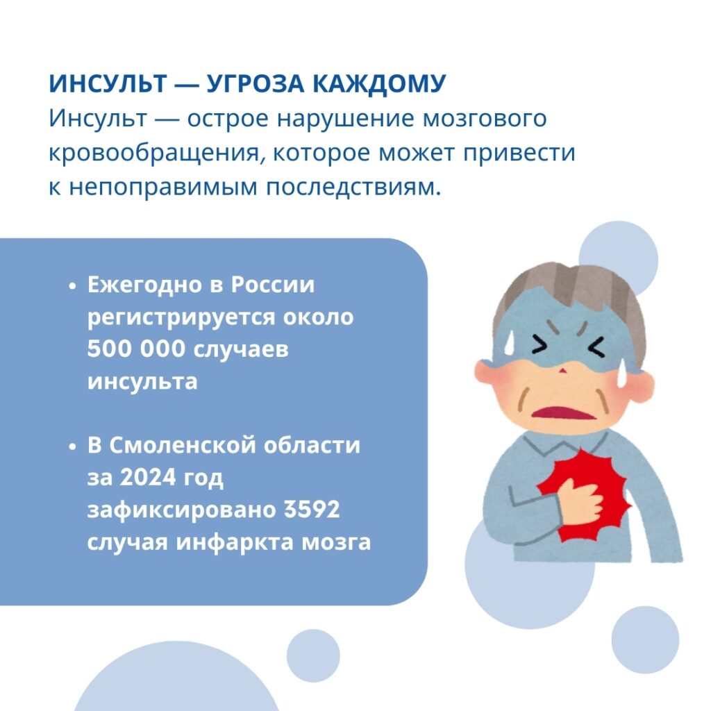 Согласно статистическим данным, В Смоленской области за 2024 год цереброваскулярные болезни (группа заболеваний головного мозга, обусловленных патологическими изменениям его сосудов с нарушением мозгового кровообращения) составили около 3% от общей заболеваемости.