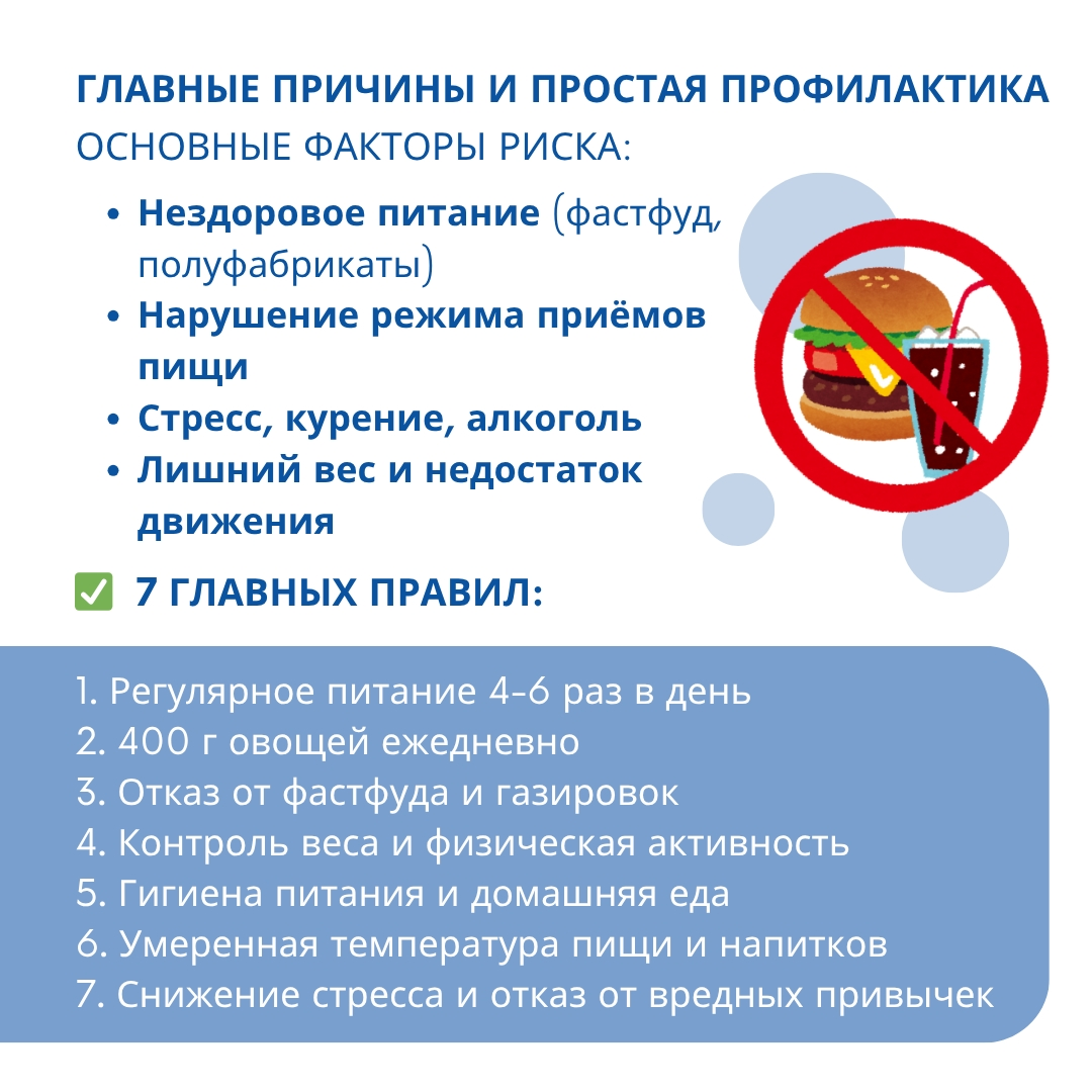 Основными причинами развития заболеваний ЖКТ являются нездоровое питание (фастфуд, полуфабрикаты) и нарушение режима приёмов пищи, высокий уровень стресса, курение, злоупотребление алкоголем, избыточный вес и гиподинамия.