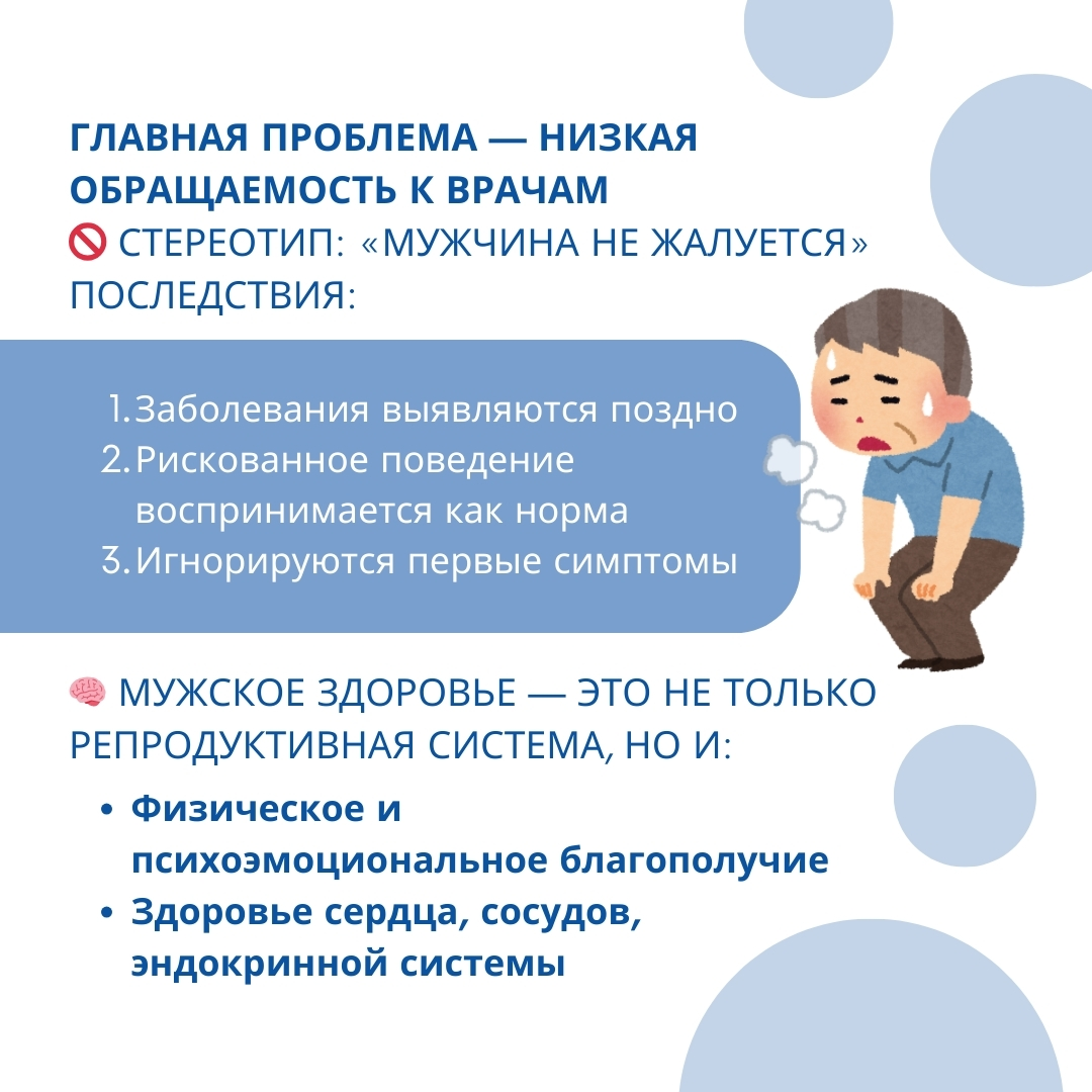 Главная проблема мужского здоровья — низкая обращаемость к врачам. Существует культурный стереотип, что мужчина должен быть «сильным» и не жаловаться на недомогание. Мужчины зачастую обращаются за помощью только тогда, когда «терпеть уже невозможно».