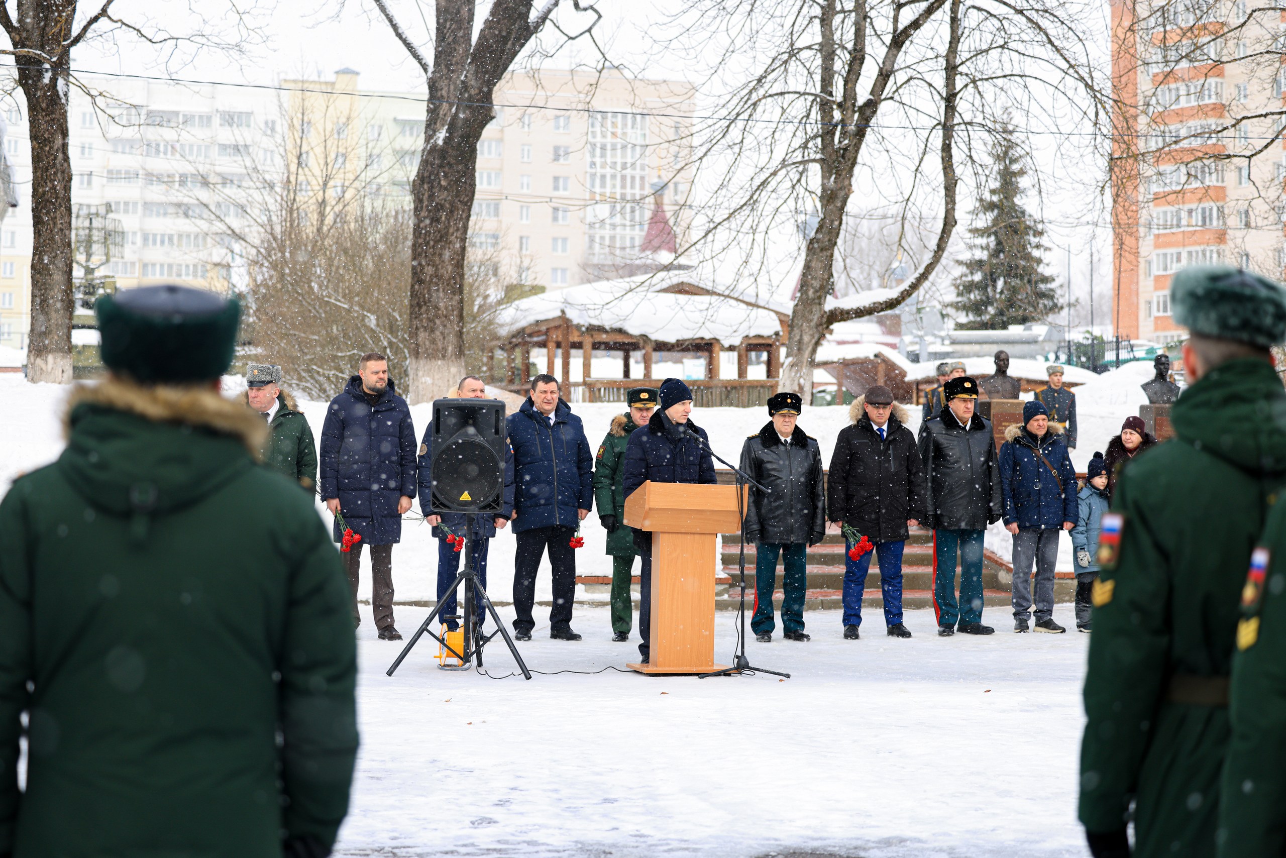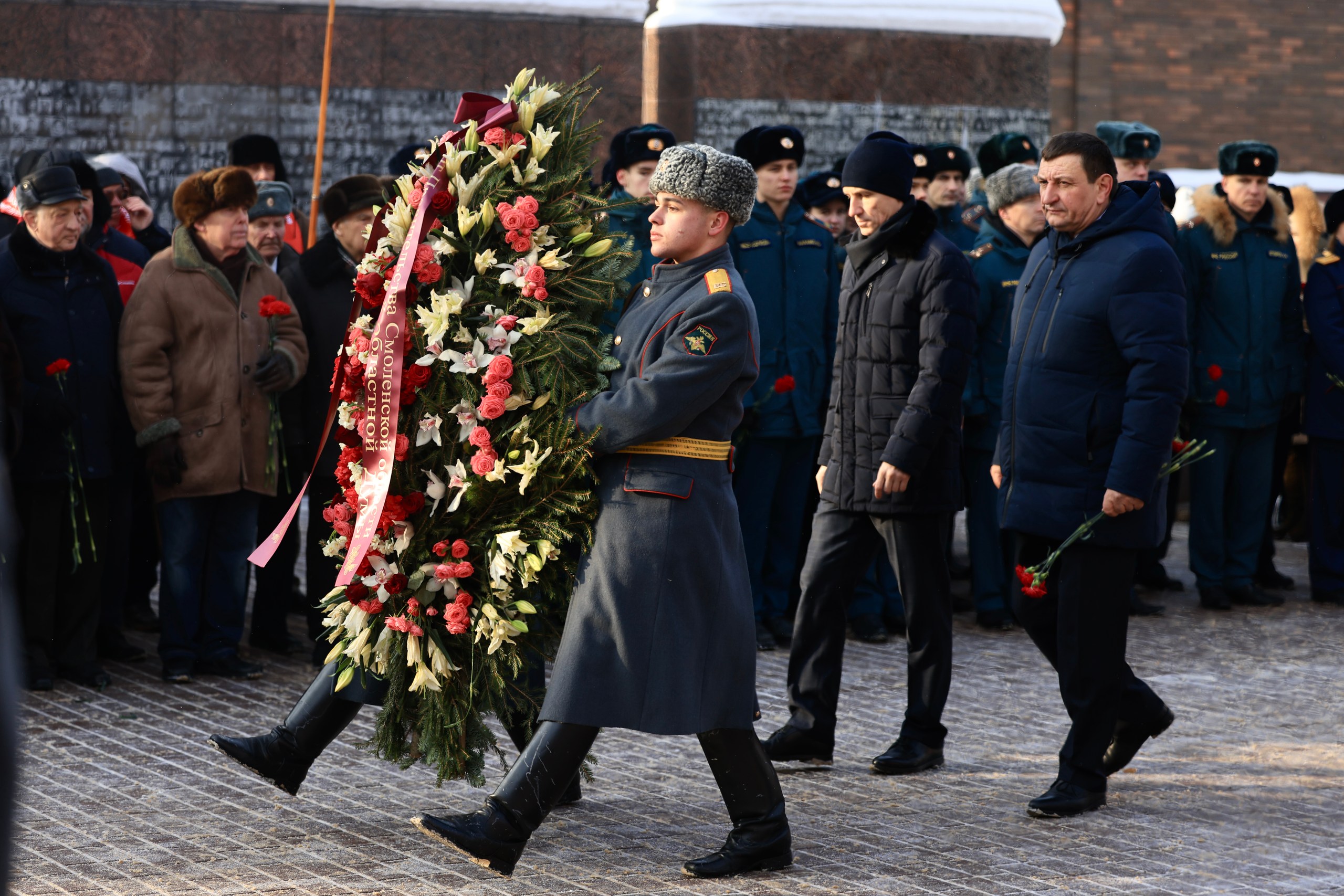 В преддверии Дня защитника Отечества в Сквере Памяти Героев состоялся памятный митинг. В торжественном мероприятии приняли участие Губернатор Василий Анохин, Председатель Смоленской областной Думы Игорь Васильевич Ляхов, главный федеральный инспектор по региону Юрий Эдуардович Стрелецкий, депутатский корпус, духовенство, молодежь. К собравшимся обратился Василий Анохин, который подчеркнул, что наши земляки с честью проходили через суровые испытания Великой Отечественной войны, Афганской и Чеченской кампаний, проявляя стойкость, героизм и самоотверженность.