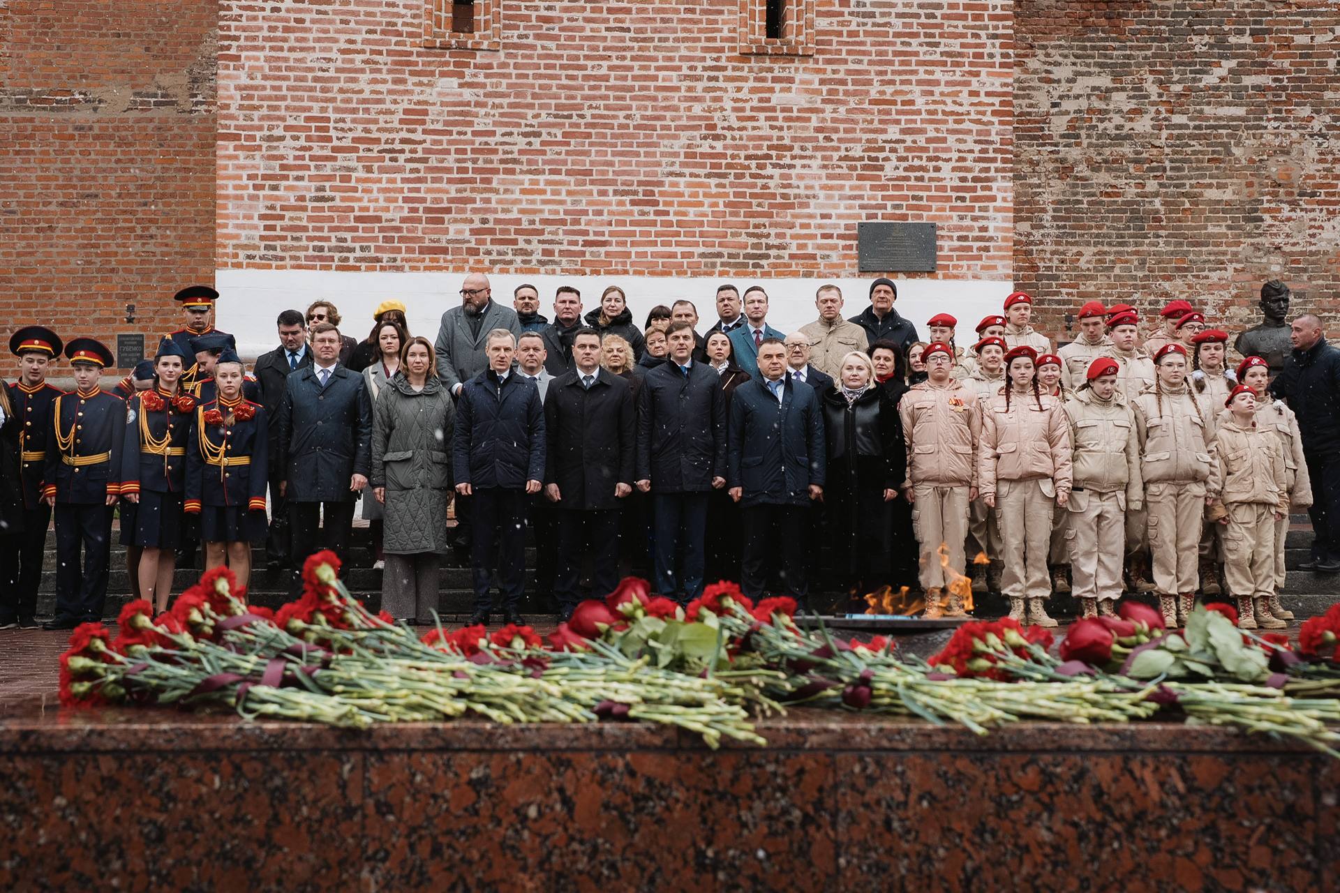 В Сквере Памяти Героев в Смоленске российская и белорусская делегации возложили цветы к Вечному Огню и могилам защитников Отечества.